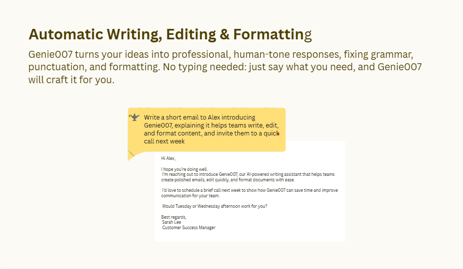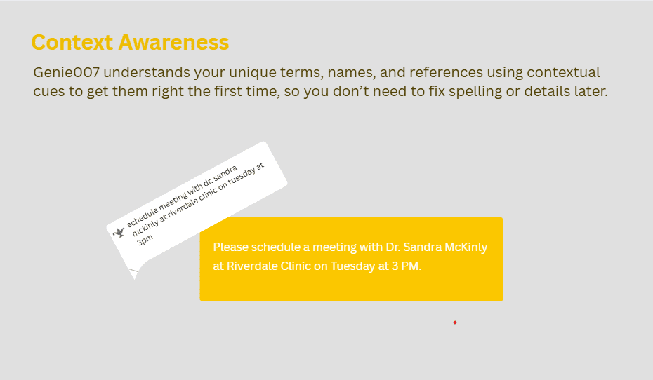 Don’t dictate words. Just share your thoughts. Genie007 delivers what you MEAN, not what you say.