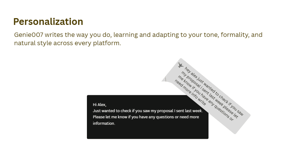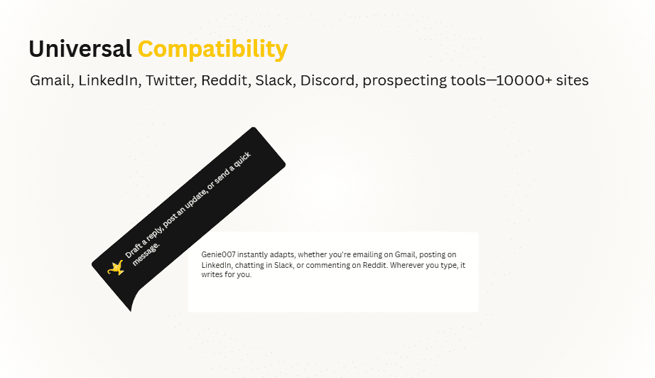 No matter where you work, whether it’s Gmail, Slack, Notion, iMessage, WhatsApp, Discord, Google Docs, or even your browser, Genie007 is right there with you.